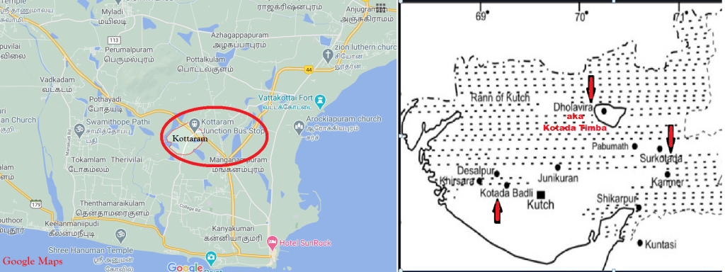 Among the various Harappan sites of Gujarat, three unique sites in the Kutch District are Surkotada, Kotada-Timba (local name of the Dholavira), and Kotada-Bhadli; perhaps there are many more ‘Kotadas’ in Gujarat. Based on the Tamil word ‘கோட்டை’ (‘kōttai’) which means ‘Fortress’, I guessed that the word ‘Kotada’ might be the native (Gujarati) word for ‘Fort’; thanks to my friend who confirmed (by referring to the Gujarat tourism website) that ‘Kotada’ indeed means ‘large fort’. In fact, archaeological remains of fortification walls are found at each of these three excavated Harappan sites. To complete the list of similarities discussed in this post, we have a village named ‘Kottaram’ (‘Kottāram’) in the Kanya-Kumari district of Tamil Nadu. ‘Wikipedia’ states that the village was ruled by Travancore ‘Mahārājas’ (kings of Thiruvananthapuram) during the 18th and early 19th centuries and hence the village got the name ‘Kottāram’, which means ‘palace’ in the Malayalam language. It could very well be so but still, I would like to notify you here that although ‘அரண்மனை’ (‘araNmanai’) is the commonly used Tamil word to denote a royal palace, one can actually find ‘palace’ as the English translation of the Tamil word ‘kottāram’ (‘கொட்டாரம்’) in Tamil to English dictionaries. I believe that, in the Indian sense, a king’s ‘palace’ always meant a fortress or a mansion within a citadel complex. I derive this notion from the fact that excavations at almost every major Harappan site have so far exposed fortification walls but no signs of extravagantly luxurious palaces. My conception gets further strengthened by the anatomy of the Tamil word ‘அரண்மனை’ (usually translated as ‘palace’), in which ‘அரண்’ means ‘fort’/’castle’ and ‘மனை’ means ‘house’/’plot’. When all is said and done, we realize that the Gujarati ‘kotada’ is analogous to the Tamil/Malayalam ‘kottaram’ in terms of implication (meaning) and phonetics (sound). Thus there is a chance that ‘kotada’ is a modification of ‘kottāram’, especially because the sound ‘ra’ is pronounced as ‘da’ in certain Hindi words (and perhaps in Gujarati too).