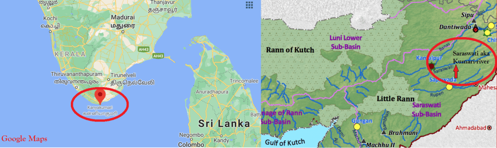 In ‘The Lost River’ authored by Michel Danino, one can find (on Page No. 49) the information about a river that bears the name ‘Saraswati’ alias ‘Kumari’. This is definitely not the ancient majestic River Sarasvati that once flowed through the deserts of Rajasthan (India) and Cholistan (Pakistan); this is but another small river that has its source at the south-western tip of Aravalli Hills. This Saraswati’s full course runs for hardly a distance of 200 km to join the Little Rann of Kutch; as it does not ‘mingle’ with the ocean, it is also known as ‘Kumari’ (meaning ‘virgin’). Now, when we travel down to the south again on our journey of spotting the perplexing parallelisms between the Kutch region and the Kachcha-theevu surroundings, we have this holy town called ‘Kanyā-Kumari’ (spelt without diacritics as ‘Kanya-Kumari’) at the southernmost tip of peninsular India, which is generally referred to as ‘Kumari’, especially in Tamil literature. It is the native deity ‘Devi Kanyā-Kumari’ (goddess ‘Shree Bhagavathy’ in the form of a ‘virgin girl’) who has bestowed her name to the town as well as the district which houses the town of Kanya-Kumari. Moreover, there is a popular belief that there was a river named ‘Kumari’ in a now-submerged landmass that once existed just below the present-day Kanya-Kumari.