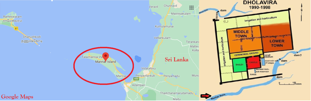 ‘Manhar’ is one of the two seasonal streams which quenched the thirst of Dholavira, a Harappan town of the ancient past, located in the Kutch region of Gujarat. One can notice that this ‘Manhar’ is comparable with the name ‘Mannar’ (‘Mannār’) of an important town in the northernmost part of Sri Lanka, owing to which the Gulf of Mannar got its name. The prominence of ‘Mannar’ is demonstrated in the names ‘Mannar’ District (to which the Mannar town belongs), Mannar island (where the Mannar town is situated), and the Talai-Mannar settlement of Sri Lanka.