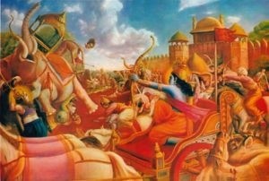 Lord Balarama and Krishna received Vishnu’s divine weapons in two chariots (including Sharanga – the bow) in the battle field and emerged victorious against the humongous army.