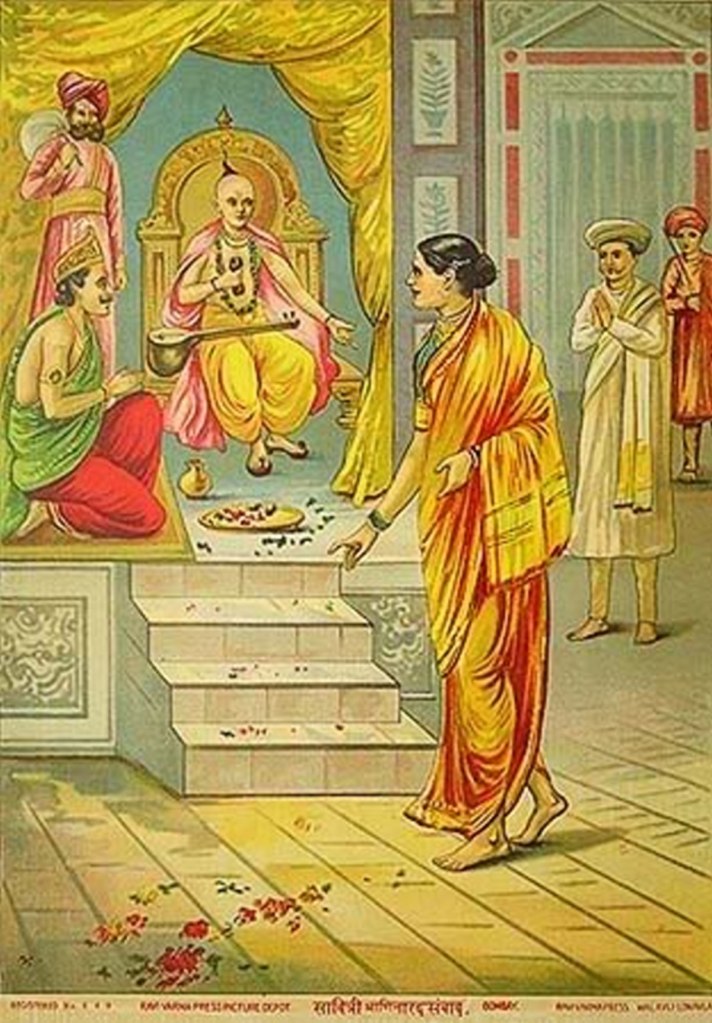 Aswapati then makes a formal proposal to Satyavan’s father and the wedding was solemnized in the presence of the Rishis of the Forest.