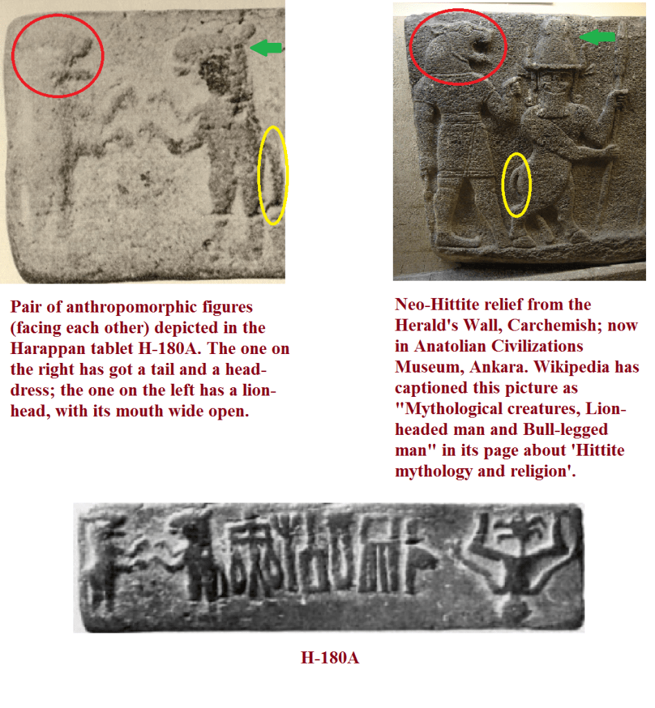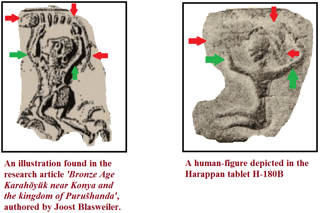 As I possess no knowledge about the culture of proto-historic Konya, and also because I could not succeed in gathering authentic details about the iconography of the concerned Harappan tablet, I am currently unable to interpret the depicted images in a proper manner. Nonetheless, certain illustrations given by Joost Blasweiler in his document about Karahöyük-Konya appear much similar to the figures depicted in H-180B.