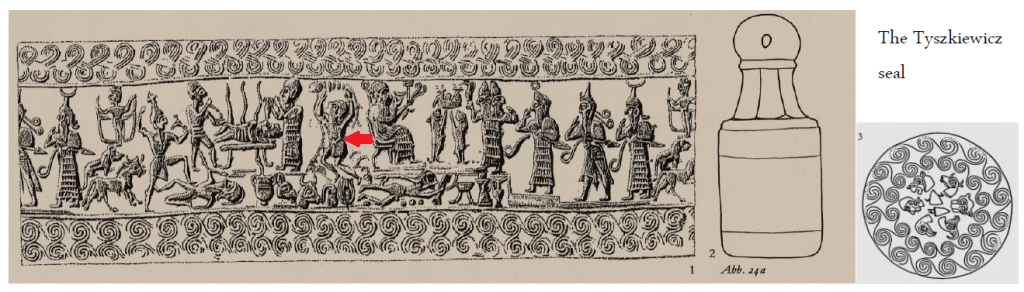 The illustration shown on the left-hand side in Image-15 is actually the imprint of one of the motifs depicted in the Tyszkiewicz seal (see Image-16) dated circa 1800 BCE by Sedat Alp; as per the caption given by Joost Blasweiler on page 19 of his document, “One assumes that this seal originates from Karahöyük near Konya.”