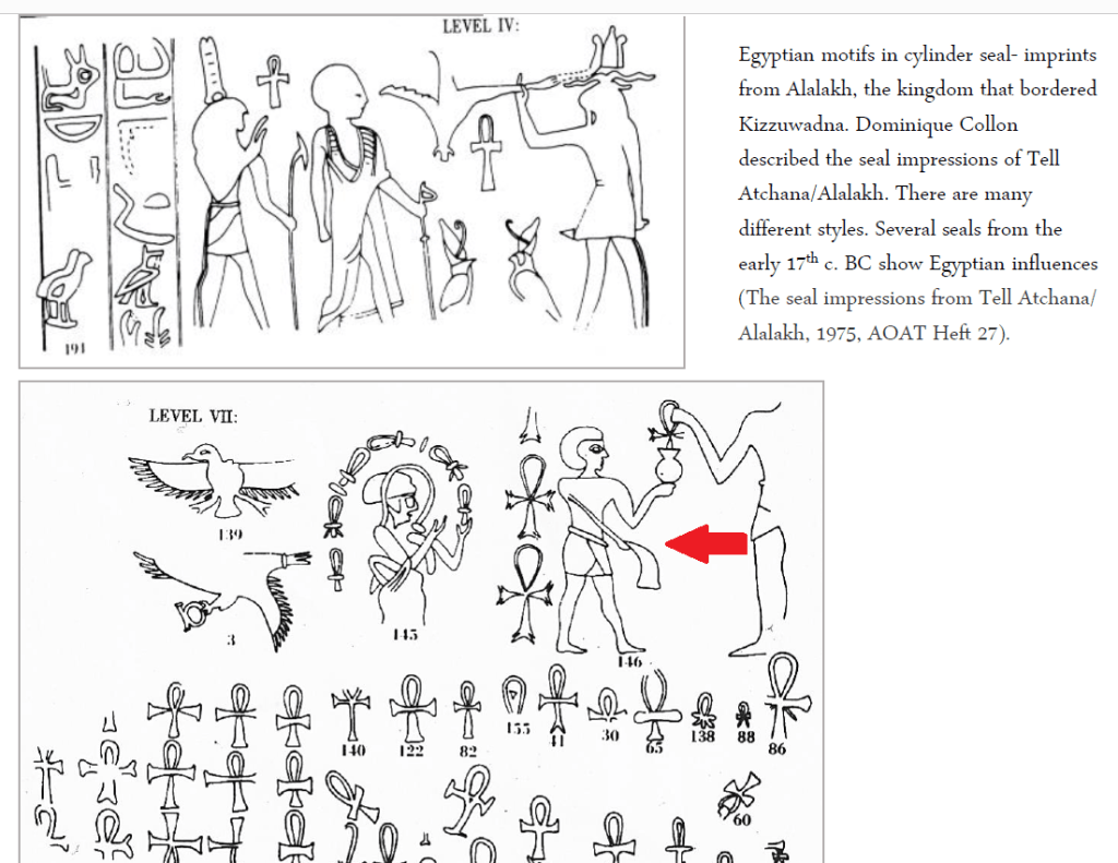 Joost Blasweiler’s illustration, seen in Image-13, shows the imprint of one of the Egyptian motifs depicted in a cylinder seal which is actually from Alalakh (a bronze-age North-Syrian kingdom); Blasweiler specifies that several seals from the early 17th century BCE show Egyptian influences (see Image-14). Blasweiler’s document states that many cylinder seals from Alalakh were found at Karahöyük-Konya. It also states, “The find of seven cylinder seals from Tell Atçana, which is the ancient city Alalakh, probably reveals Karahöyüks (trade) relation with this region.”