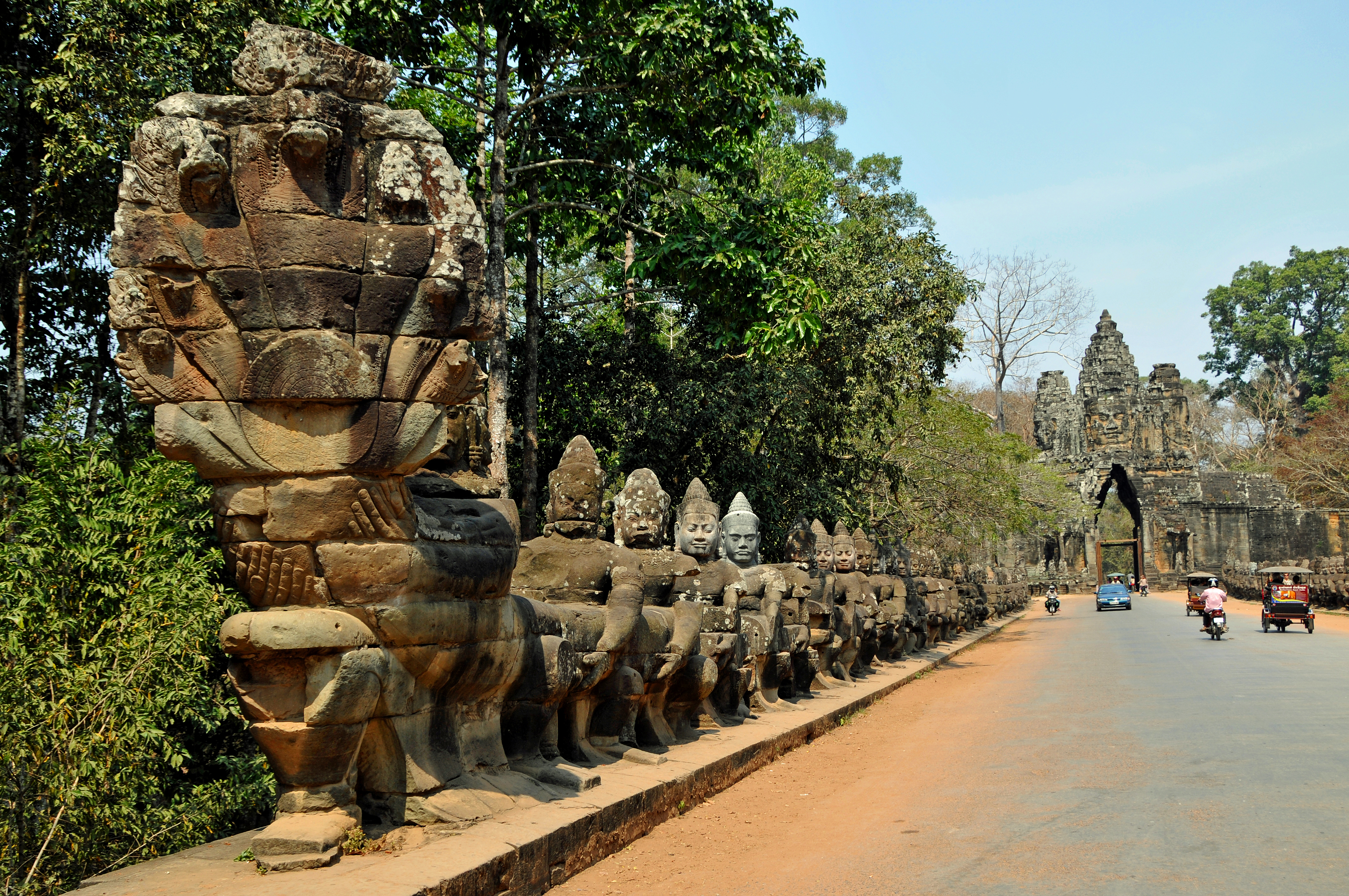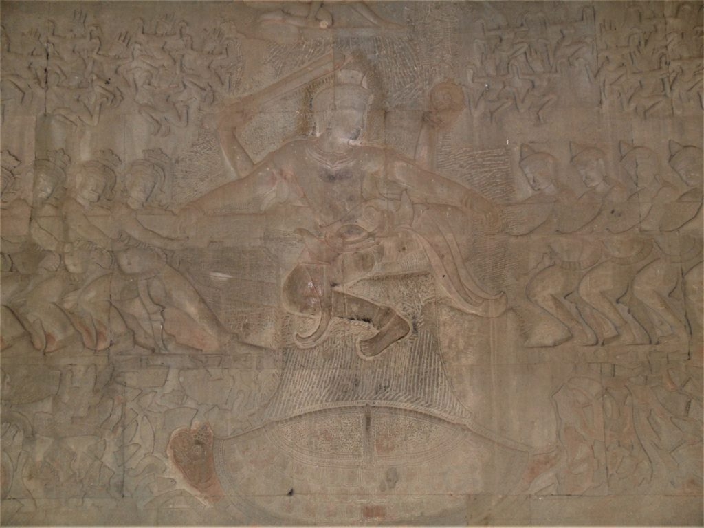 This mythological tale is very popular in Khmer iconography. The most famous architectural rendition of this legend is shown among the 13000 square feet in a dedicated gallery at the Angkor Wat temple in Cambodia. The grand causeway entrances at the ancient city of Angkor Thom also depict the scenes from the churning of the ocean in sculptural form.