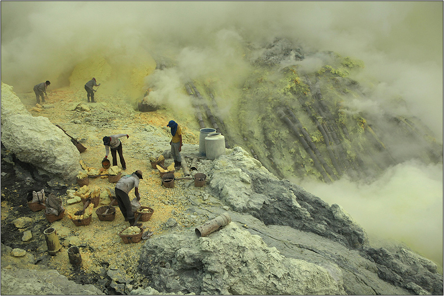 Kawah Ijen Crater Lake, according to Wikipedia, is the site of a labour-intensive sulphur mining operation, in which sulphur-laden baskets are carried by hand from the crater floor.