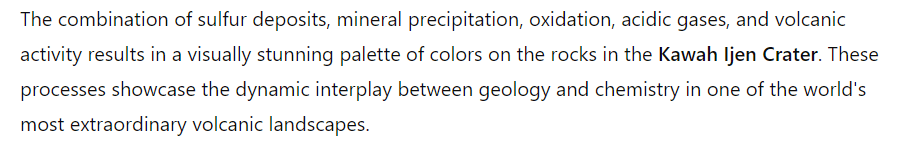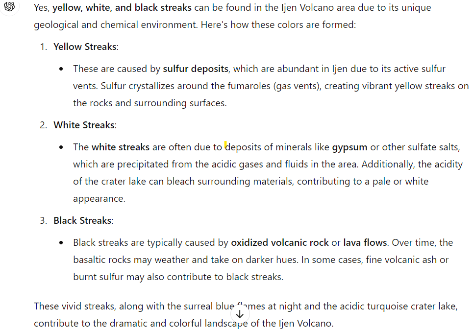 Based on the above information provided by Chat GPT, I interpreted the words ‘gold’, ‘silver’, and ‘collyrium’ as ‘yellow’, ‘white,’ and ‘black’. Incidentally, Chat GPT confirmed the presence of yellow, white, and black coloured streaks in Ijen Volcano.
