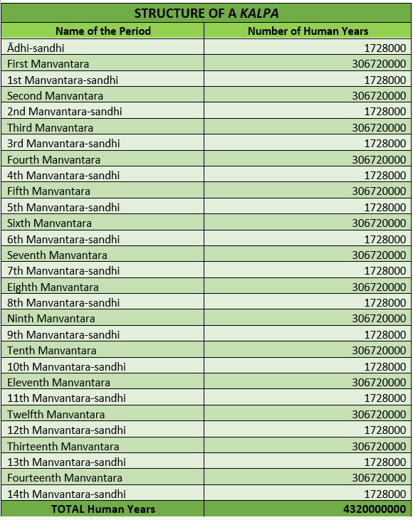 According to the Hindu Purānas, time, which is infinite, witnesses recurring cycles of creation. Every two subsequent cycles of creation are punctuated by a period of dissolution. Creation and sustenance of the universe and its 14 Lokas happen during a Mahā-Kalpa. Every Mahā-Kalpa lasts for 311.04 trillion Human Years and is followed by a Mahā-pralaya, of the same length, during which everything gets absorbed into the source of creation. A Mahā-Kapla consists of 36,000 Kalpas and 36,000 Naimittika-pralayas, each lasting 4.32 billion Human Years. All 14 Lokas of the universe are dissolved during a Mahā-pralaya whereas only the bottom 10 of the 14 (including the earthly realm) are destroyed during a Naimittika-pralaya. Every Kalpa is divided into 14 Manvantaras. Each Manvantara comprises a set of 71 consecutive Chatur-Yugas. A Manvantara-sandhi lasting for 1,728,000 Human Years bridges two subsequent Manvantaras. A period of the same duration, called Ādhi-sandhi, precedes the first Manvantara of every Kalpa. The universe is partially destroyed during every Manvantara-sandhi and is restored at the beginning of the following Manvantara; this partial destruction is termed Manvantara-pralaya.