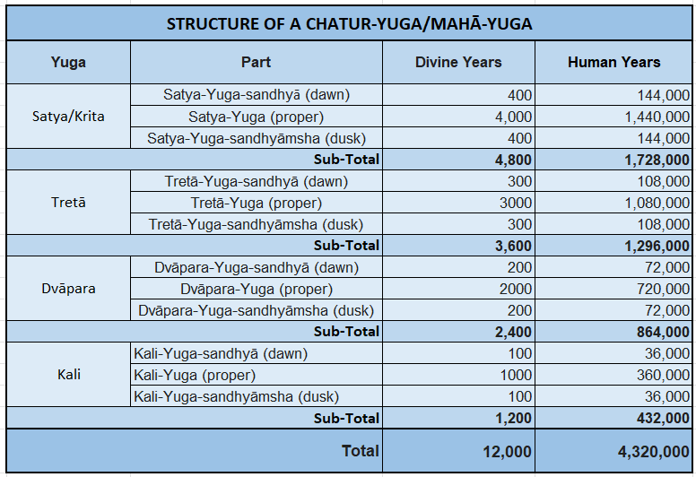 A Chatur-Yuga (aka Mahā-Yuga) = a Krita-Yuga + a Tretā-Yuga + a Dvāpara-Yuga + a Kali-Yuga