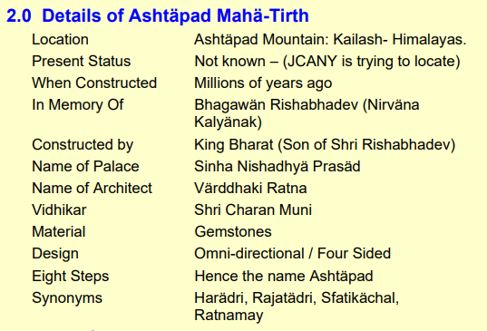 The Jain Research Centre of America has published a pamphlet about the imagined replica of Shri Ashtāpad Mahā-tīrth installed by it in a Jain temple in New York, USA. The pamphlet contains significant details about the Ashtāpad Mountain and the temple/palace built on it by King Bharath to memorialise his father Rishabhanāth. Page 19 of the pamphlet mentions that Ashtāpad Mountain is probably up in the Himalayas, about 168 miles north of Badrinath, a town in the Indian state of Uttarakhand. However, certain clues from Hindu purānas seemingly hint that the sacred mountain is at a different location.