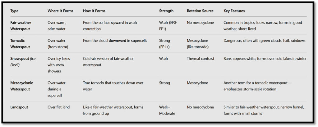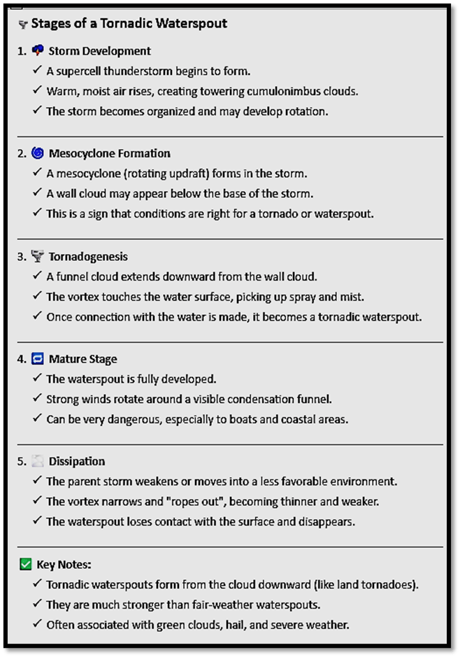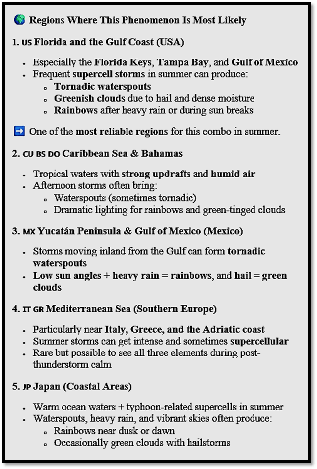 When I asked ChatGPT about the parts of the world that witness the combination of 🌪️ tornadic waterspouts, 🌈 rainbows, and 🟩 greenish clouds during summer, it stated, “While this trio is uncommon, there are certain parts of the world where all three can align, especially during severe thunderstorms over water in the warm season.”