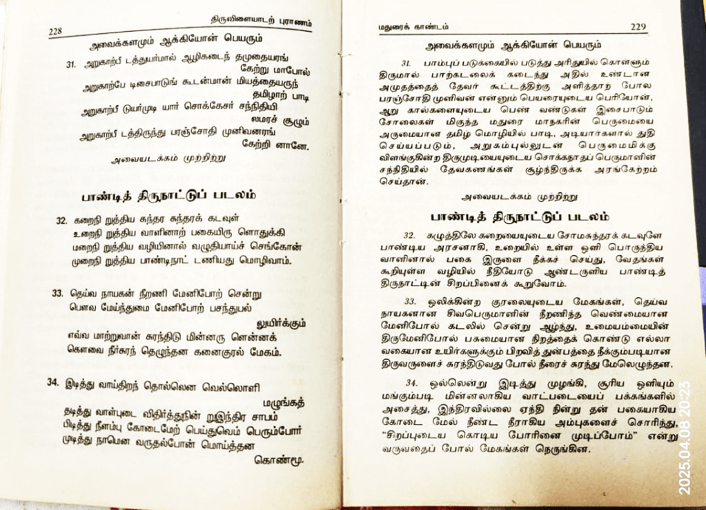 The TIRUVILAYĀDAL PURĀNAM, supplemented with V. Jothi (M.A.)’s commentary and published by Varthamanan Pathippagam, explains a significant atmospheric phenomenon in the ancient Pandyan land, as described by the author Paranjothi Munivar. The relevant verses (Nos. 33 & 34), belonging to the Madurai-kāndam, are given with their interpretations on pages 228–229 of Volume 1 (second edition: 1998).